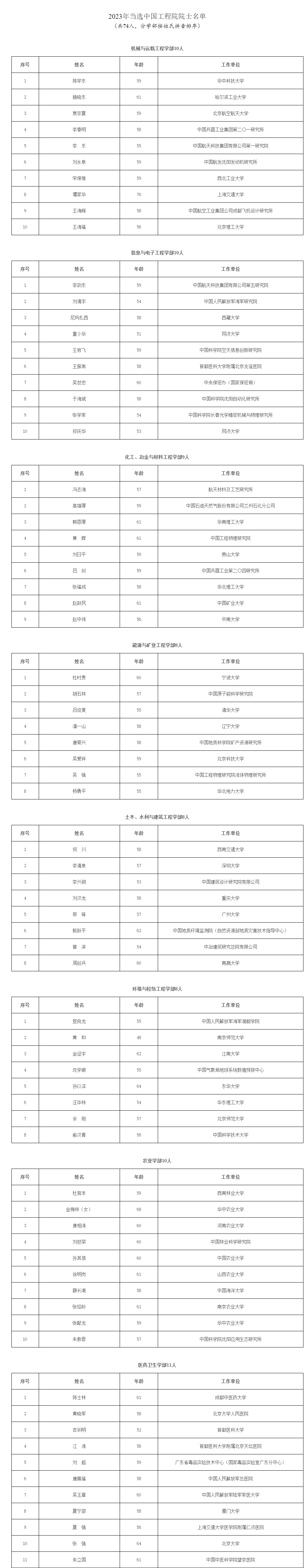 北京11月22日电 (记者赵竹青)11月22日,中国工程院官网公布了2023年院士增选结果:2023年共选举产生中国工程院院士74人。
